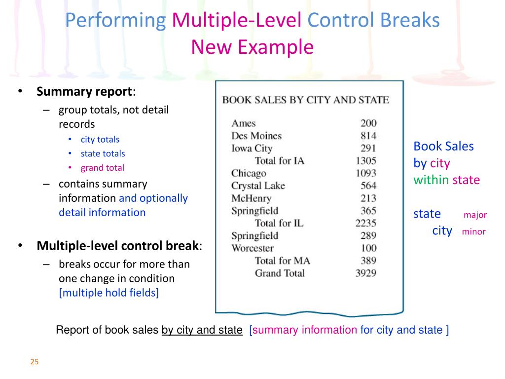 Performing Multiple-Level Control BreaksNew Example • Summary report: • group totals, not detail records • city totals • state totals • grand total • contains summary information and optionally detail information • Multiple-level control break: • breaks occur for more than one change in condition [multiple hold fields] Book Sales by city withinstate state major city minor Report of book sales by city and state[summary information for city and state ]