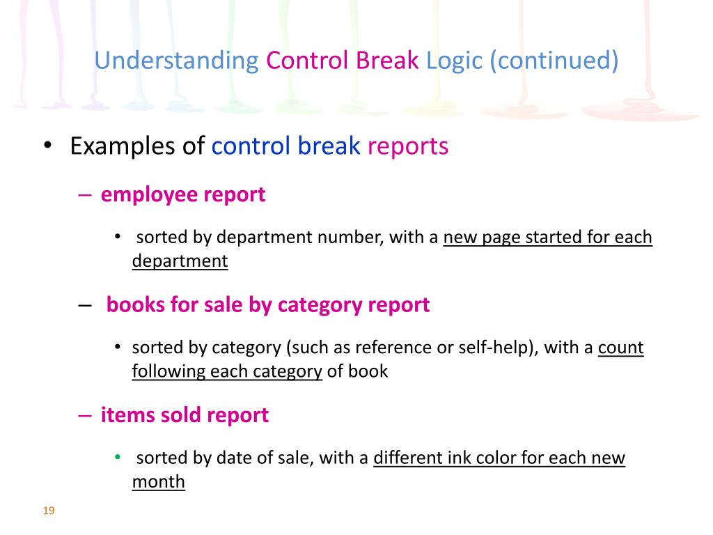Understanding Control Break Logic (continued) • Examples of control break reports • employee report • sorted by department number, with a new page started for each department • books for sale by category report • sorted by category (such as reference or self-help), with a count following each category of book • items sold report • sorted by date of sale, with a different ink color for each new month