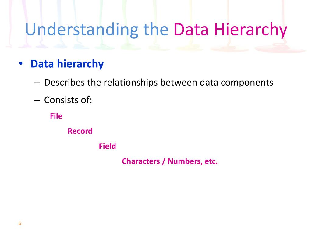 Understanding the Data Hierarchy • Data hierarchy • Describes the relationships between data components • Consists of: File Record Field Characters / Numbers, etc.