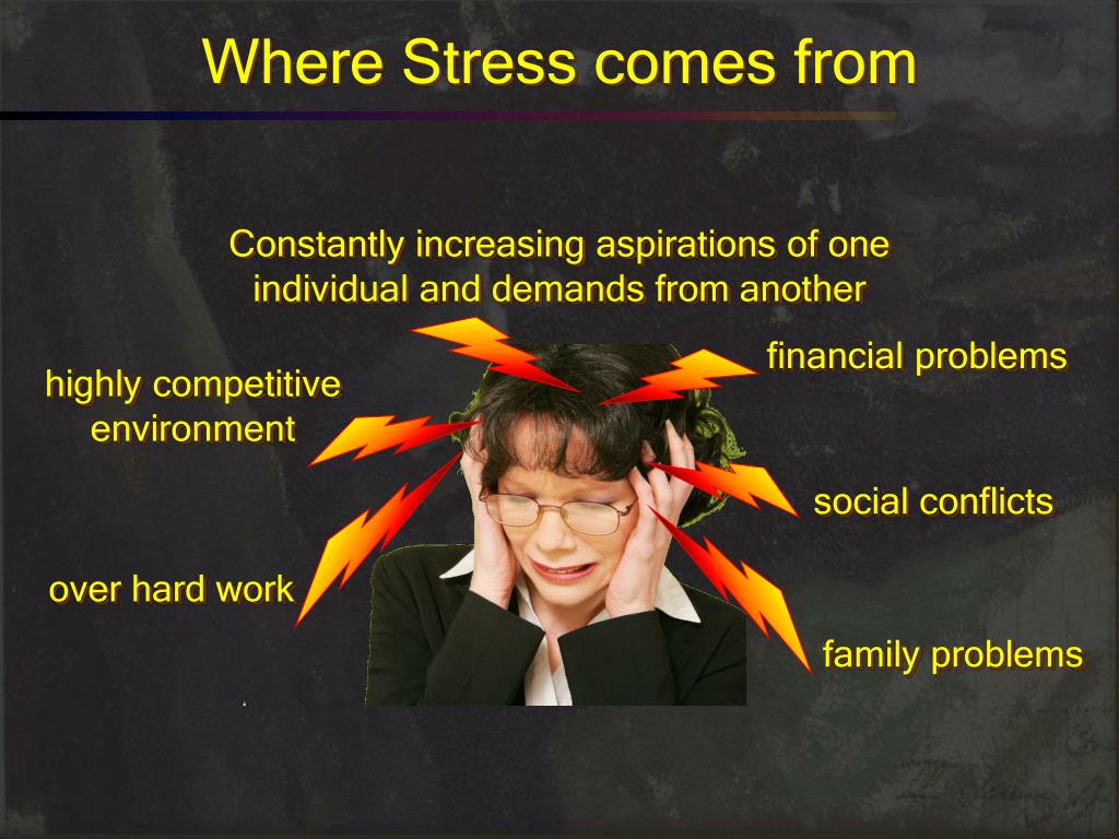 Where Stress comes from Constantly increasing aspirations of one individual and demands from another financial problems highly competitive environment social conflicts over hard work family problems