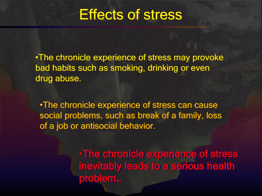 Effects of stress • The chronicle experience of stress may provoke bad habits such as smoking, drinking or even drug abuse. • The chronicle experience of stress can cause social problems, such as break of a family, loss of a job or antisocial behavior. • The chronicle experience of stress inevitably leads to a serious health problem…
