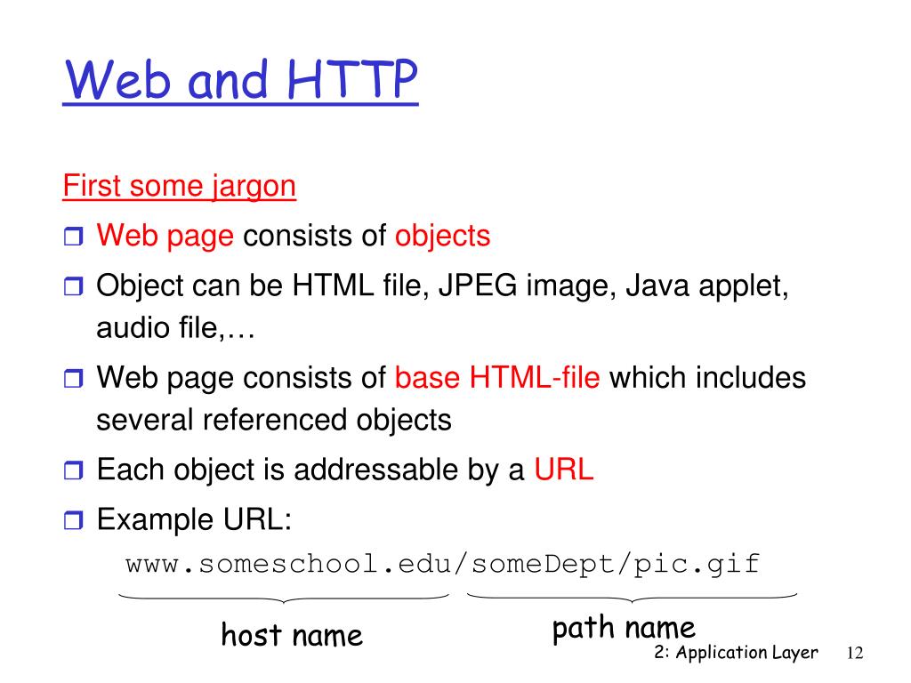 2: Application Layer www.someschool.edu/someDept/pic.gif path name host name Web and HTTP • First some jargon • Web page consists of objects • Object can be HTML file, JPEG image, Java applet, audio file,… • Web page consists of base HTML-file which includes several referenced objects • Each object is addressable by a URL • Example URL: