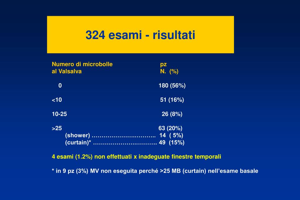 324 esami - risultati Numero di microbolle pz al Valsalva N. (%) 0 180 (56%) <10 51 (16%) 10-25 26 (8%) >25 63 (20%) (shower) ………………….……….. 14 ( 5%) (curtain)* ………………….……….. 49 (15%) 4 esami (1.2%) non effettuati x inadeguate finestre temporali * in 9 pz (3%) MV non eseguita perché >25 MB (curtain) nell’esame basale