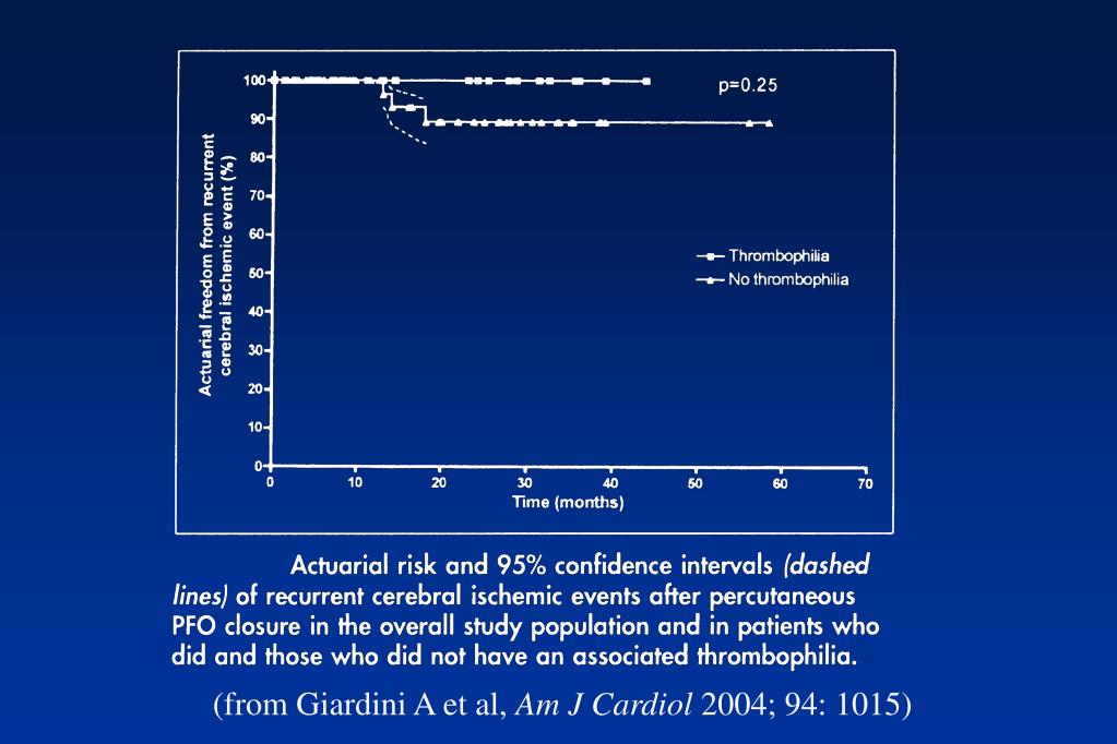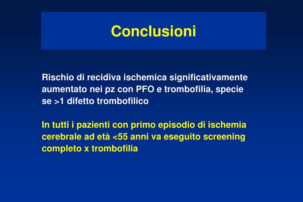 Conclusioni Rischio di recidiva ischemica significativamente aumentato nei pz con PFO e trombofilia, specie se >1 difetto trombofilico In tutti i pazienti con primo episodio di ischemia cerebrale ad età <55 anni va eseguito screening completo x trombofilia