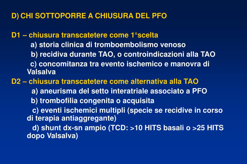 CHI SOTTOPORRE A CHIUSURA DEL PFO D1 –chiusura transcatetere come 1°scelta a) storia clinica di tromboembolismo venoso b) recidiva durante TAO, o controindicazioni alla TAO c) concomitanza tra evento ischemico e manovra di Valsalva D2 – chiusura transcatetere come alternativa alla TAO a) aneurisma del setto interatriale associato a PFO b) trombofilia congenita o acquisita c) eventi ischemici multipli (specie se recidive in corso di terapia antiaggregante) d) shunt dx-sn ampio (TCD: >10 HITS basali o >25 HITS dopo Valsalva)