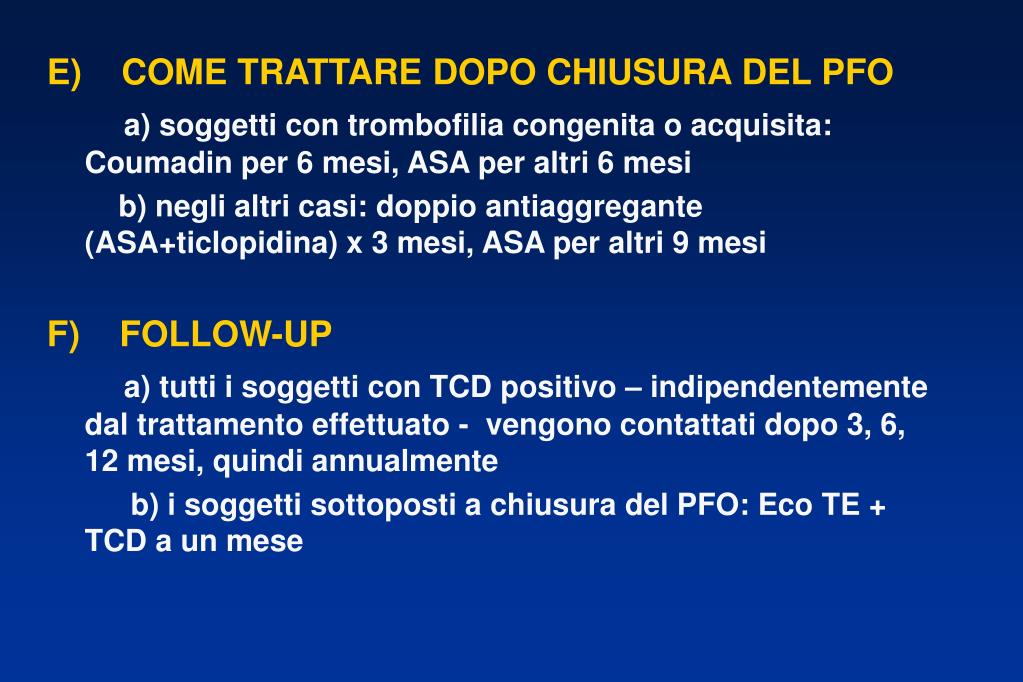 E)COME TRATTARE DOPO CHIUSURA DEL PFO a) soggetti con trombofilia congenita o acquisita: Coumadin per 6 mesi, ASA per altri 6 mesi b) negli altri casi: doppio antiaggregante (ASA+ticlopidina) x 3 mesi, ASA per altri 9 mesi F)FOLLOW-UP a) tutti i soggetti con TCD positivo – indipendentemente dal trattamento effettuato - vengono contattati dopo 3, 6, 12 mesi, quindi annualmente b) i soggetti sottoposti a chiusura del PFO: Eco TE + TCD a un mese