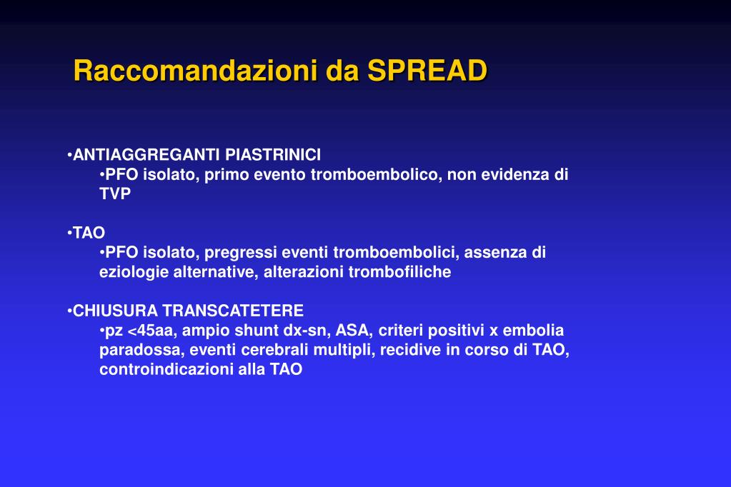 Raccomandazioni da SPREAD • ANTIAGGREGANTI PIASTRINICI • PFO isolato, primo evento tromboembolico, non evidenza di TVP • TAO • PFO isolato, pregressi eventi tromboembolici, assenza di eziologie alternative, alterazioni trombofiliche • CHIUSURA TRANSCATETERE • pz <45aa, ampio shunt dx-sn, ASA, criteri positivi x embolia paradossa, eventi cerebrali multipli, recidive in corso di TAO, controindicazioni alla TAO