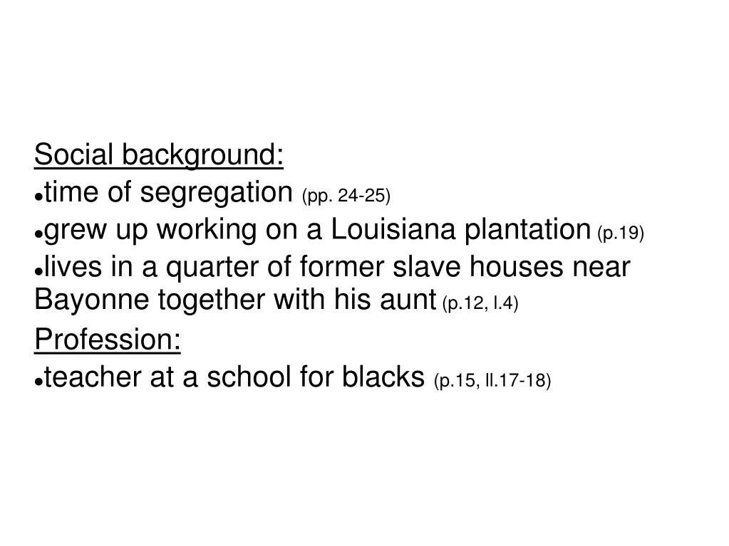 Social background: time of segregation (pp. 24-25) grew up working on a Louisiana plantation (p.19) lives in a quarter of former slave houses near Bayonne together with his aunt (p.12, l.4) Profession: teacher at a school for blacks (p.15, ll.17-18)
