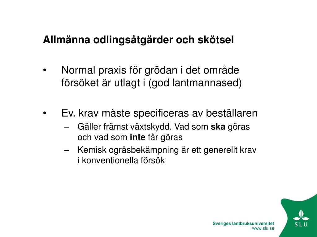 Allmänna odlingsåtgärder och skötsel • Normal praxis för grödan i det område försöket är utlagt i (god lantmannased) • Ev. krav måste specificeras av beställaren • Gäller främst växtskydd. Vad som ska göras och vad som inte får göras • Kemisk ogräsbekämpning är ett generellt krav i konventionella försök