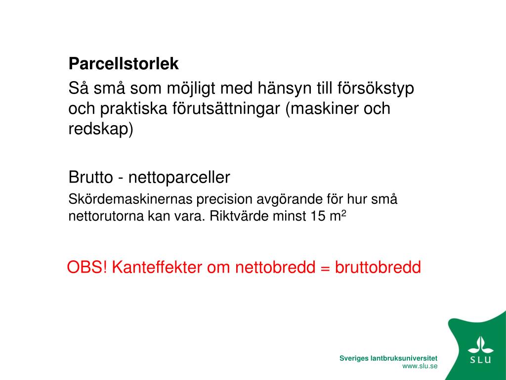 Parcellstorlek Så små som möjligt med hänsyn till försökstyp och praktiska förutsättningar (maskiner och redskap) Brutto - nettoparceller Skördemaskinernas precision avgörande för hur små nettorutorna kan vara. Riktvärde minst 15 m2 OBS! Kanteffekter om nettobredd = bruttobredd