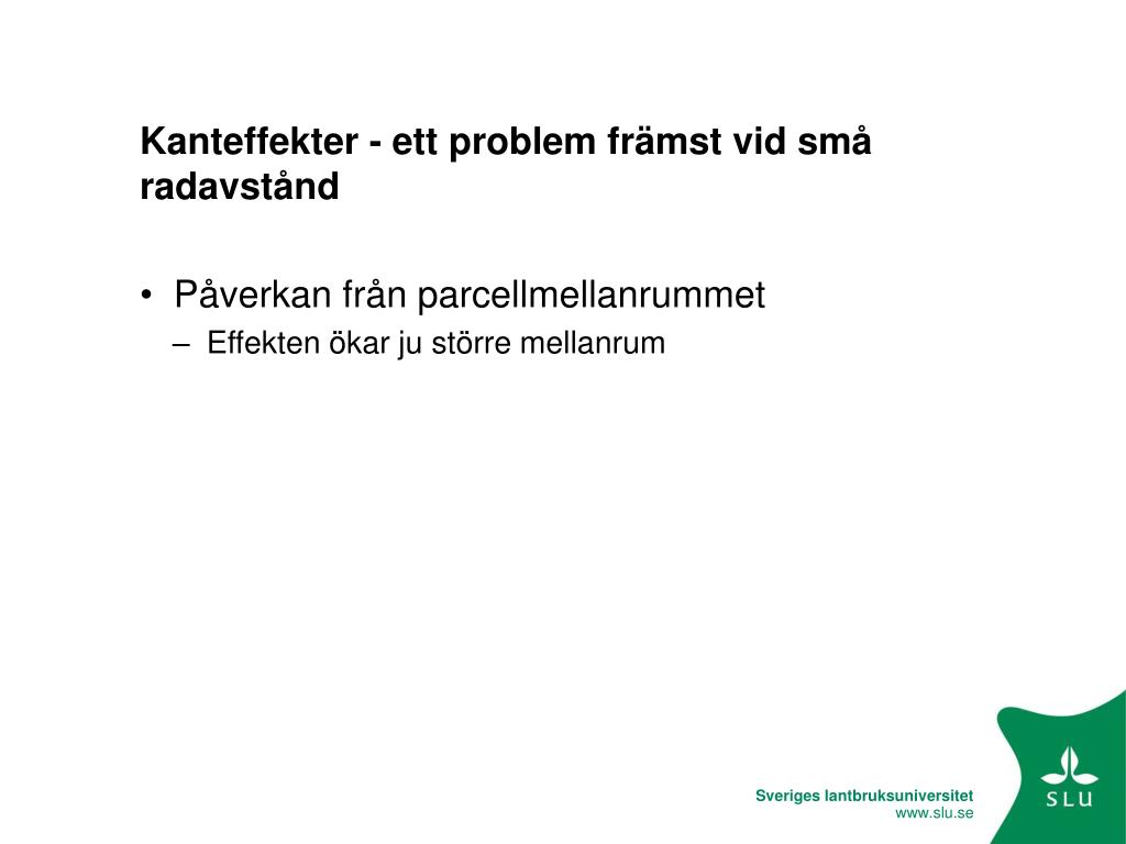 Kanteffekter - ett problem främst vid små radavstånd • Påverkan från parcellmellanrummet • Effekten ökar ju större mellanrum • Påverkan från intilliggande parcell • Olika beståndshöjd • Olika stråstyrka • Olika behandlingar (t.ex. ogödslat - kraftigt gödslat)