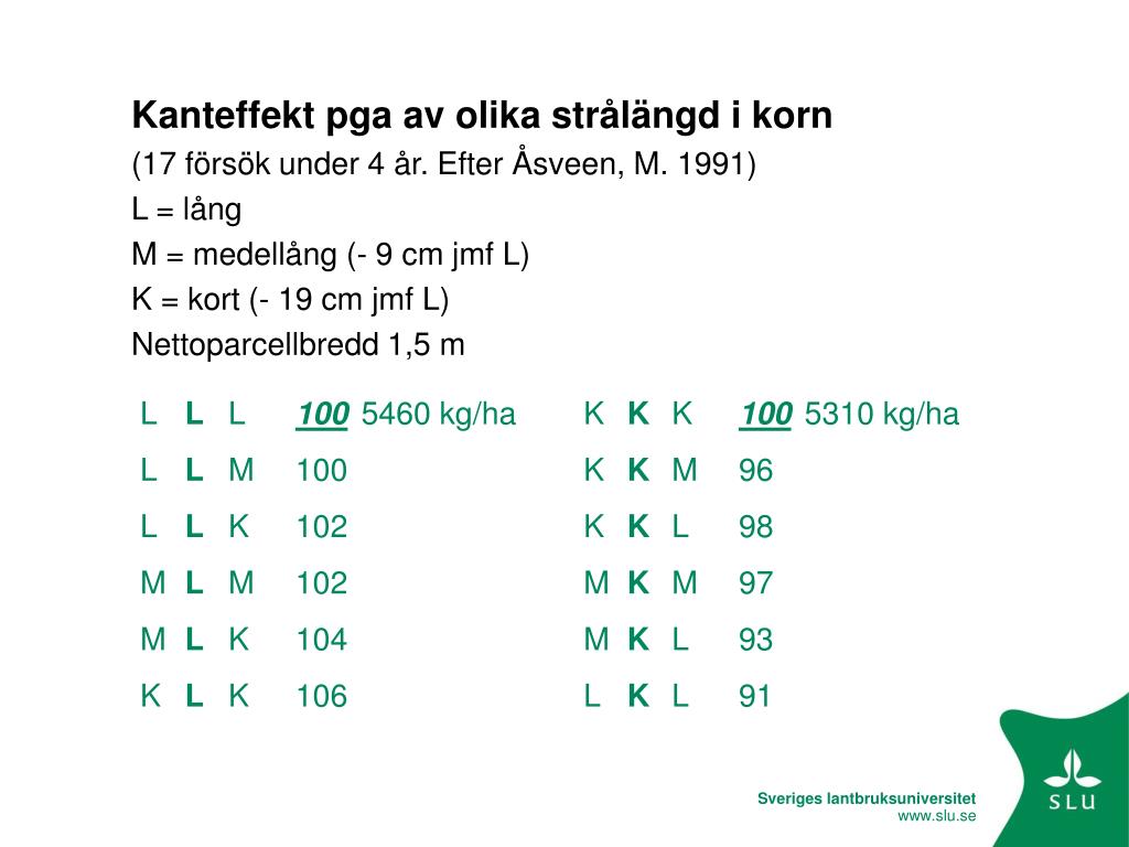 Kanteffekt pga av olika strålängd i korn (17 försök under 4 år. Efter Åsveen, M. 1991) L = lång M = medellång (- 9 cm jmf L) K = kort (- 19 cm jmf L) Nettoparcellbredd 1,5 m L L L 1005460 kg/ha K K K 1005310 kg/ha L L M 100 K K M 96 L L K 102 K K L 98 M L M 102 M K M 97 M L K 104 M K L 93 K L K 106 L K L 91