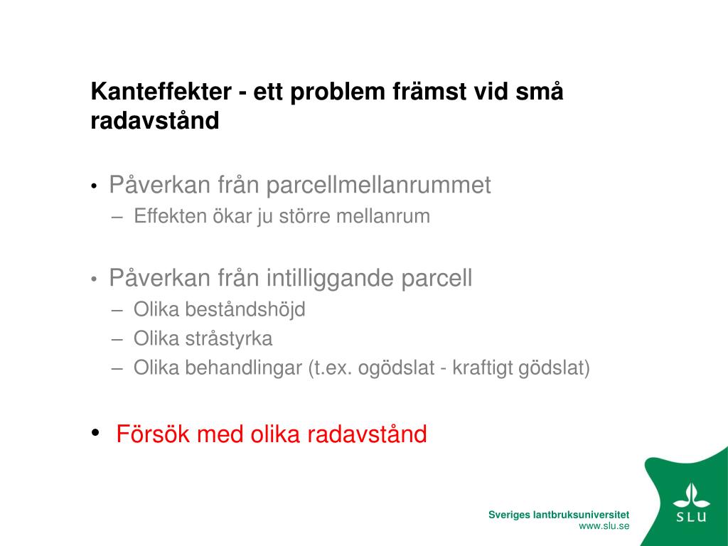 Kanteffekter - ett problem främst vid små radavstånd • Påverkan från parcellmellanrummet • Effekten ökar ju större mellanrum • Påverkan från intilliggande parcell • Olika beståndshöjd • Olika stråstyrka • Olika behandlingar (t.ex. ogödslat - kraftigt gödslat) • Försök med olika radavstånd