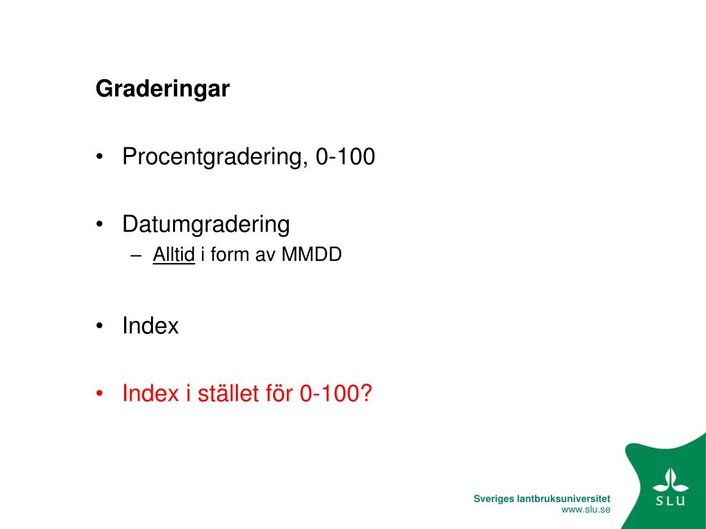 Graderingar • Procentgradering, 0-100 • Datumgradering • Alltid i form av MMDD • Index • Index i stället för 0-100?