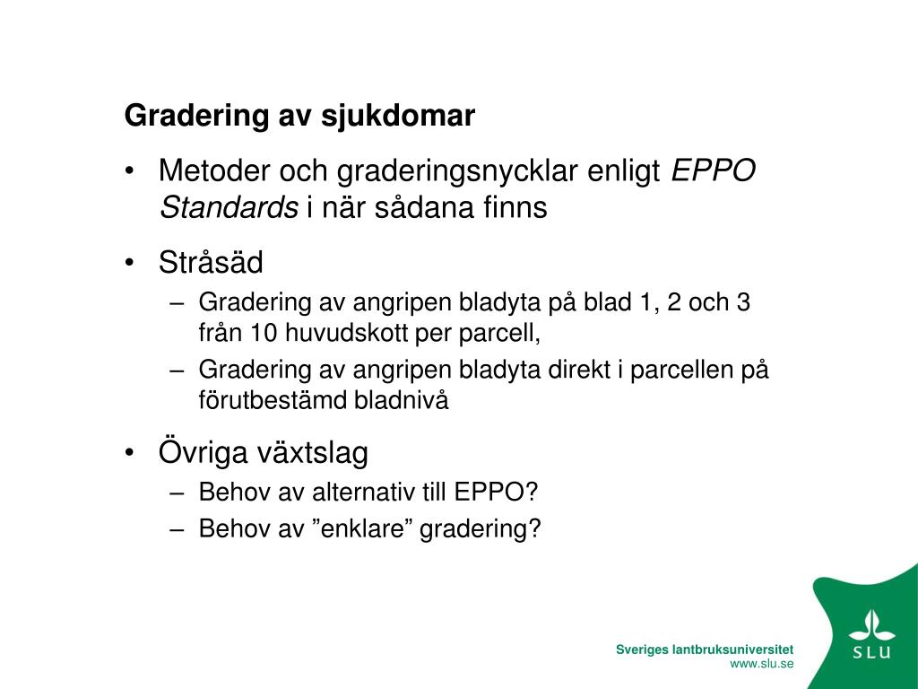 Gradering av sjukdomar • Metoder och graderingsnycklar enligt EPPO Standards i när sådana finns • Stråsäd • Gradering av angripen bladyta på blad 1, 2 och 3 från 10 huvudskott per parcell, • Gradering av angripen bladyta direkt i parcellen på förutbestämd bladnivå • Övriga växtslag • Behov av alternativ till EPPO? • Behov av ”enklare” gradering?