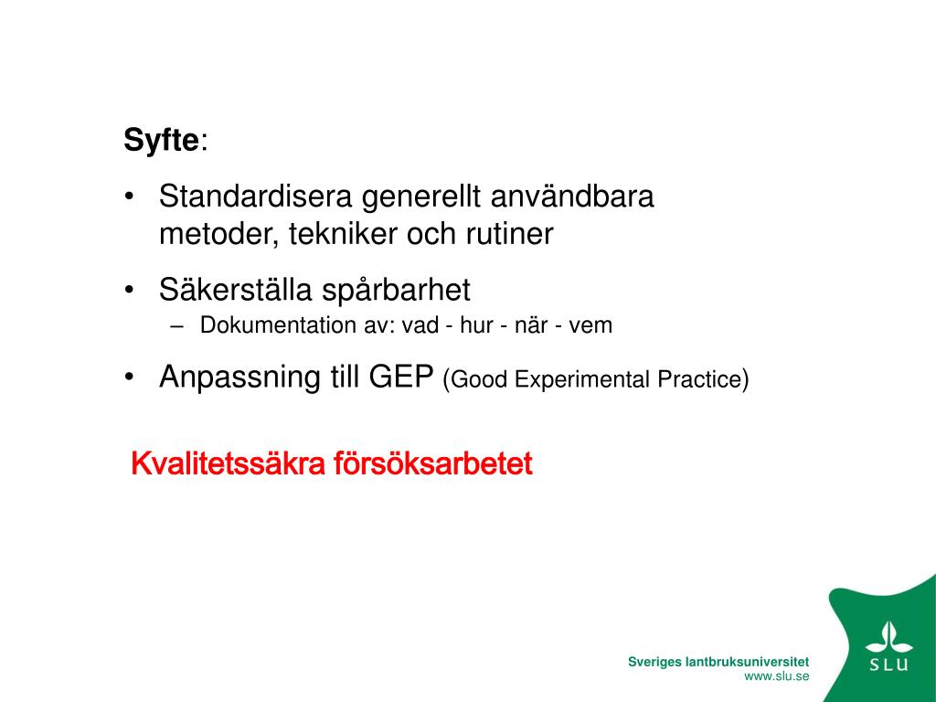 Syfte: • Standardisera generellt användbara metoder, tekniker och rutiner • Säkerställa spårbarhet • Dokumentation av: vad - hur - när - vem • Anpassning till GEP (Good Experimental Practice) Kvalitetssäkra försöksarbetet
