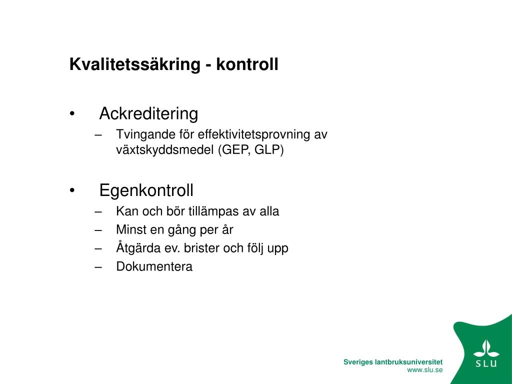 Kvalitetssäkring - kontroll • Ackreditering • Tvingande för effektivitetsprovning av växtskyddsmedel (GEP, GLP) • Egenkontroll • Kan och bör tillämpas av alla • Minst en gång per år • Åtgärda ev. brister och följ upp • Dokumentera