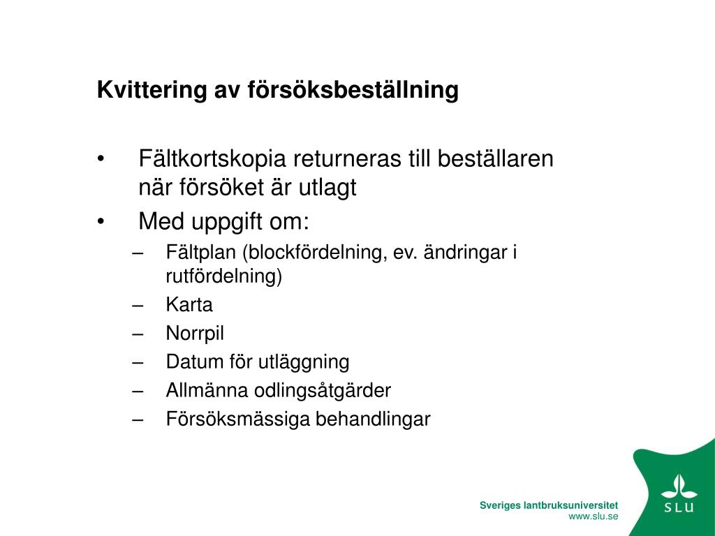 Kvittering av försöksbeställning • Fältkortskopia returneras till beställaren när försöket är utlagt • Med uppgift om: • Fältplan (blockfördelning, ev. ändringar i rutfördelning) • Karta • Norrpil • Datum för utläggning • Allmänna odlingsåtgärder • Försöksmässiga behandlingar