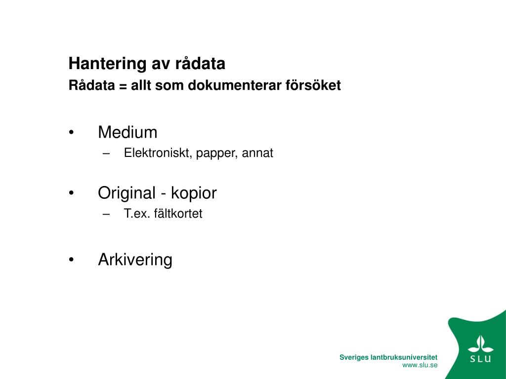 Hantering av rådata Rådata = allt som dokumenterar försöket • Medium • Elektroniskt, papper, annat • Original - kopior • T.ex. fältkortet • Arkivering