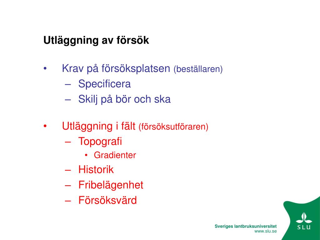 Utläggning av försök • Krav på försöksplatsen (beställaren) • Specificera • Skilj på bör och ska • Utläggning i fält (försöksutföraren) • Topografi • Gradienter • Historik • Fribelägenhet • Försöksvärd