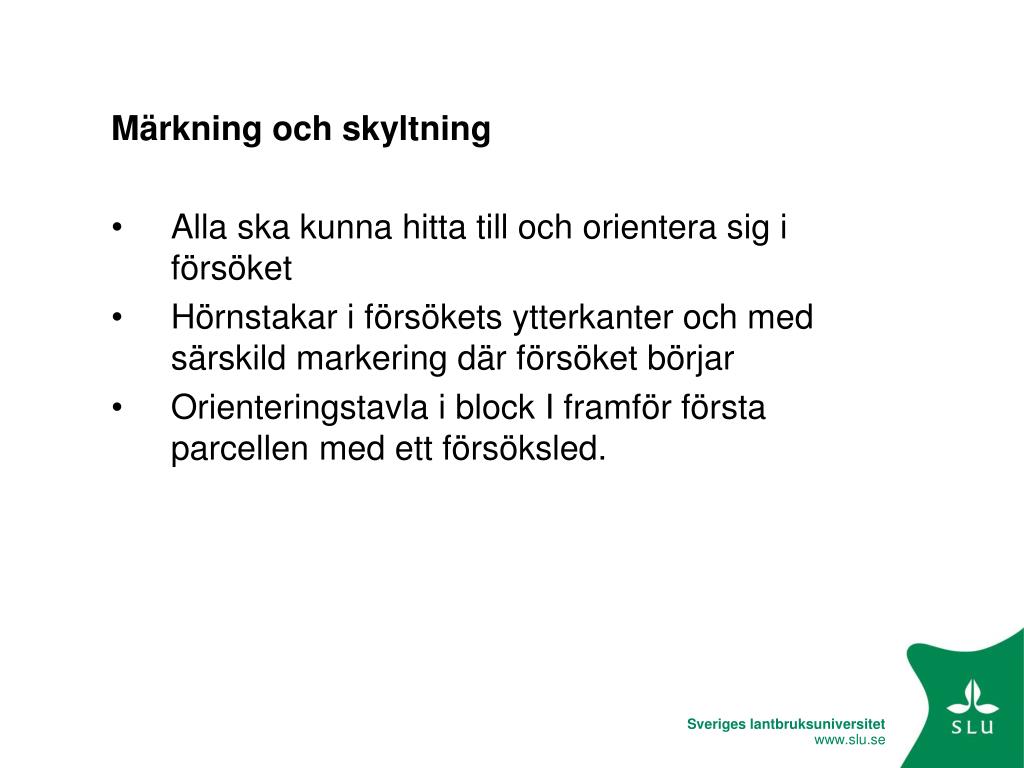 Märkning och skyltning • Alla ska kunna hitta till och orientera sig i försöket • Hörnstakar i försökets ytterkanter och med särskild markering där försöket börjar • Orienteringstavla i block I framför första parcellen med ett försöksled.