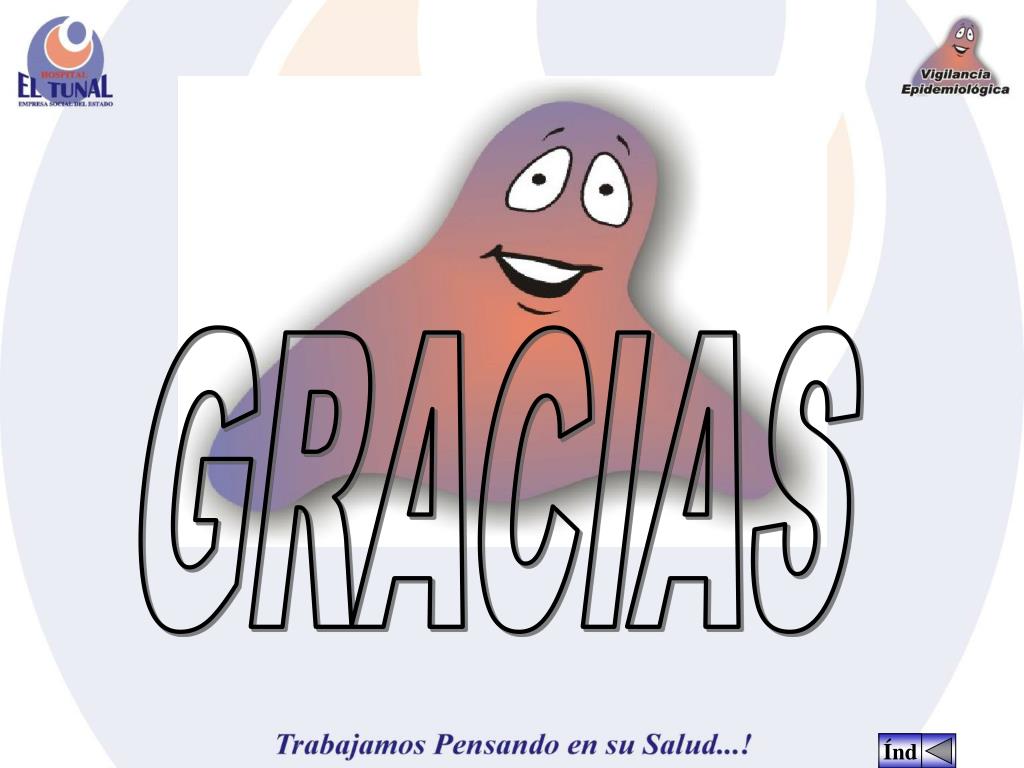 RECOMENDACIONES El éxito alcanzado en la prevención y control de SAMR, puede ser replicado en otros microorganismos multirresistentes a los antimicrobianos como Acinetobacter baumanni. Se invita a toda la comunidad hospitalaria a continuar en la lucha contra SAMR y de igual manera a aplicar las precauciones de aislamiento a pacientes infectados o colonizados por este y otros microorganismos multirresistentes a los antimicrobianos desde que se identifica la infección o colonización, hasta el egreso hospitalario. ¡PREVENIR ES LO PRIMERO! Índ Fin
