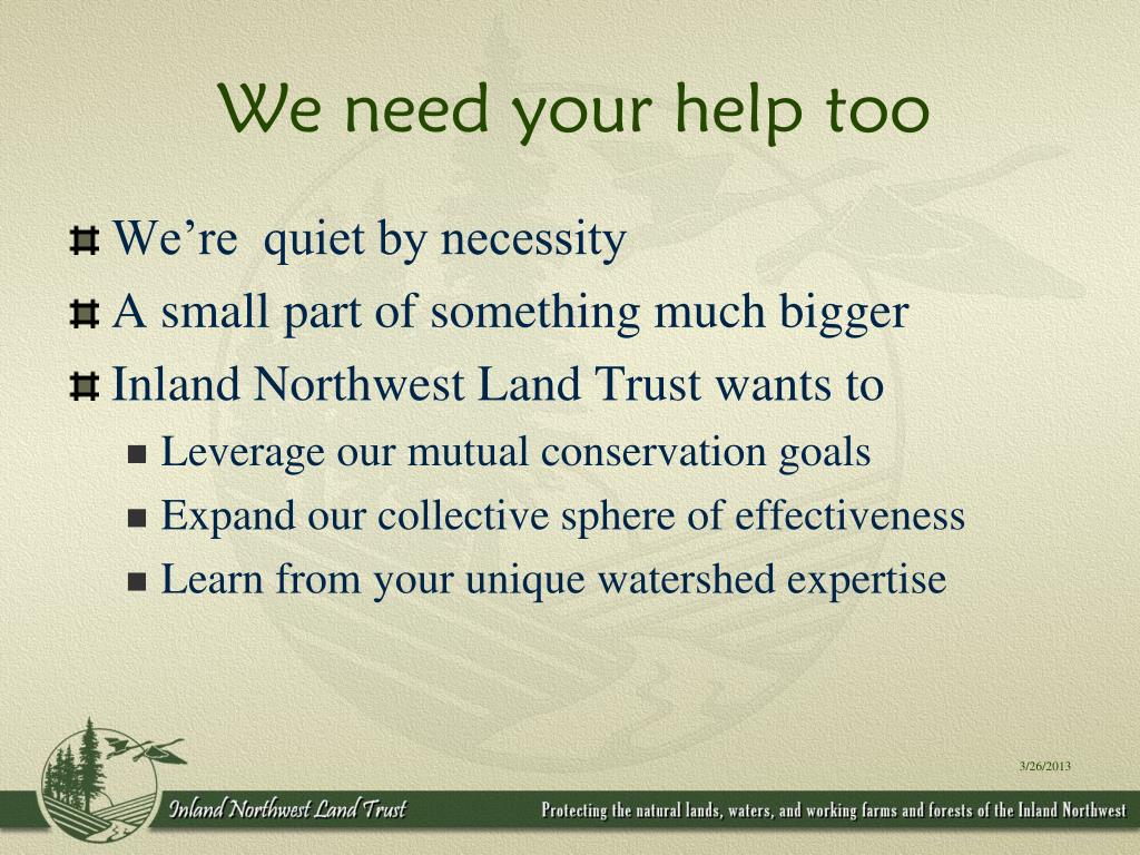What does the Inland Northwest Land Trust bring to our partners? • We fill a unique role • Permanent protection of private lands • We are NOT • Regulatory • Political • Adversarial • We invite willing, conservation-minded land owners to a leadership role in conservation 3/26/2013