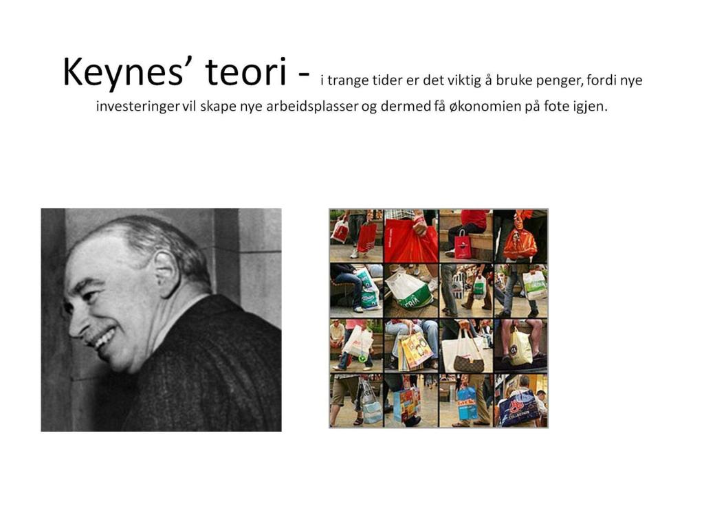 Keynes’ teori - i trange tider er det viktig å bruke penger, fordi nye investeringer vil skape nye arbeidsplasser og dermed få økonomien på fote igjen.