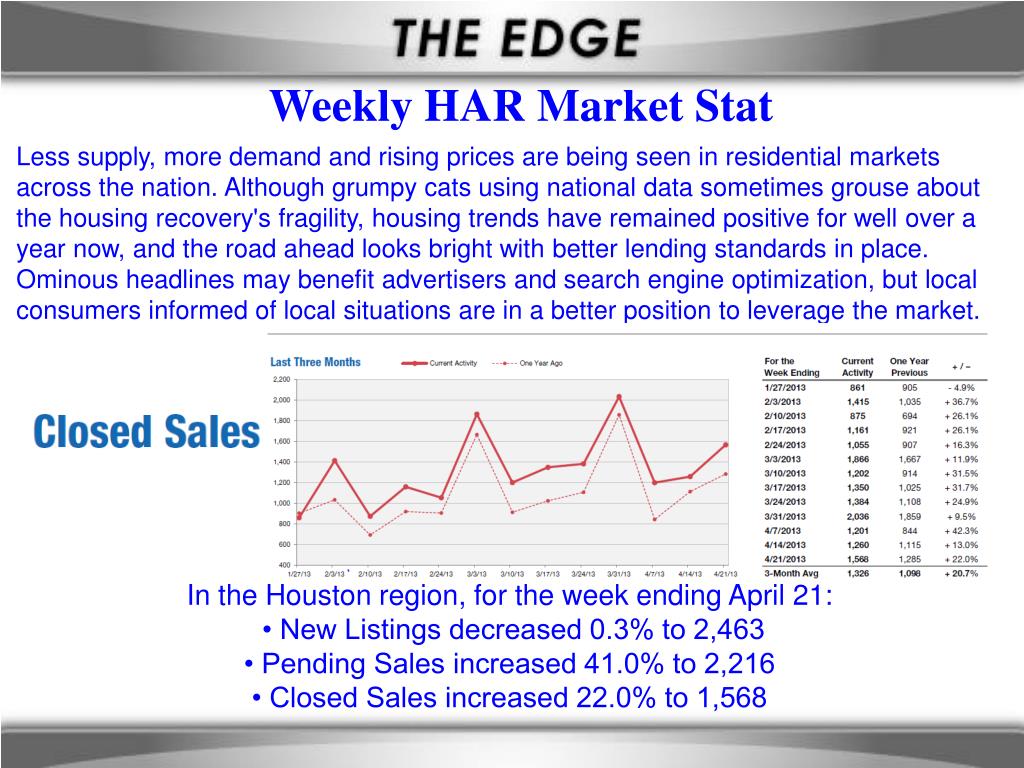 Weekly HAR Market Stat Less supply, more demand and rising prices are being seen in residential markets across the nation. Although grumpy cats using national data sometimes grouse about the housing recovery's fragility, housing trends have remained positive for well over a year now, and the road ahead looks bright with better lending standards in place. Ominous headlines may benefit advertisers and search engine optimization, but local consumers informed of local situations are in a better position to leverage the market. In the Houston region, for the week ending April 21: • New Listings decreased 0.3% to 2,463 • Pending Sales increased 41.0% to 2,216 • Closed Sales increased 22.0% to 1,568
