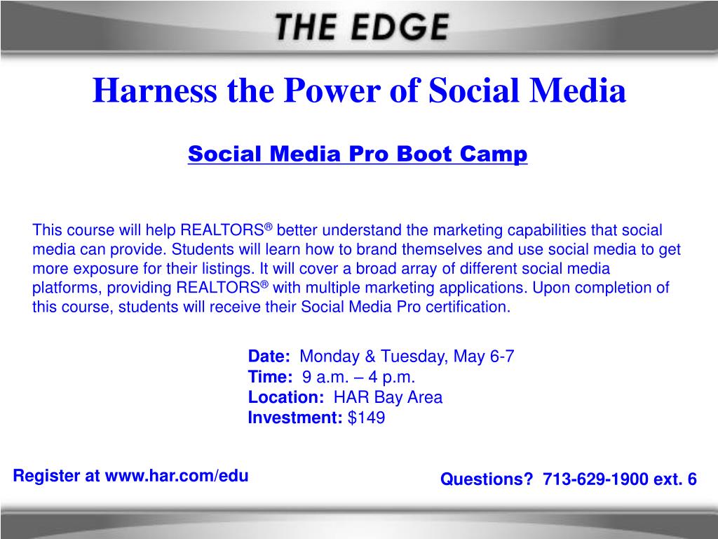 Harness the Power of Social Media • Social Media Pro Boot Camp • This course will help REALTORS® better understand the marketing capabilities that social media can provide. Students will learn how to brand themselves and use social media to get more exposure for their listings. It will cover a broad array of different social media platforms, providing REALTORS® with multiple marketing applications. Upon completion of this course, students will receive their Social Media Pro certification. • Date: Monday & Tuesday, May 6-7 • Time: 9 a.m. – 4 p.m. • Location: HAR Bay Area • Investment: $149 Questions? 713-629-1900 ext. 6 Register at www.har.com/edu