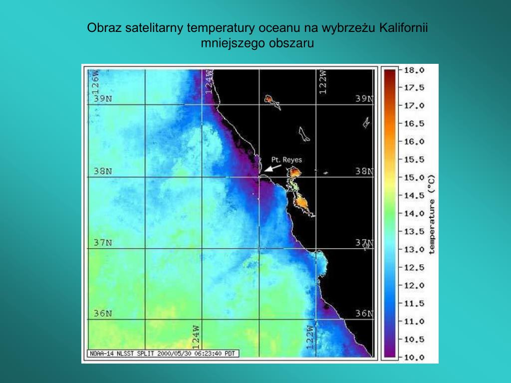 Obraz satelitarny temperatury oceanu na wybrzeżu Kalifornii wskazujący na wynoszenie zimnych wód na wybrzeżu