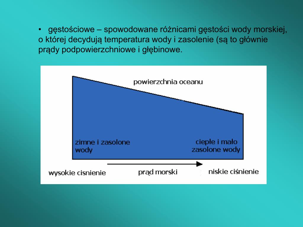 gęstościowe – spowodowane różnicami gęstości wody morskiej, o której decydują temperatura wody i zasolenie (są to głównie prądy podpowierzchniowe i głębinowe.