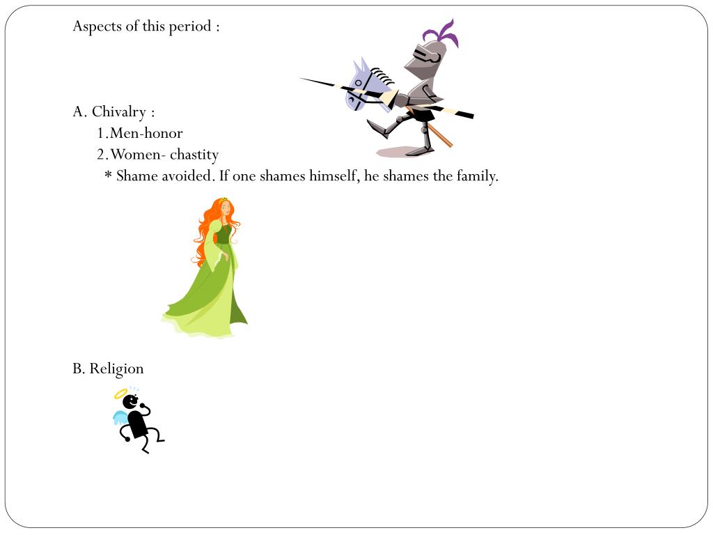 Aspects of this period : A. Chivalry : 1.Men-honor 2.Women- chastity * Shame avoided. If one shames himself, he shames the family. B. Religion
