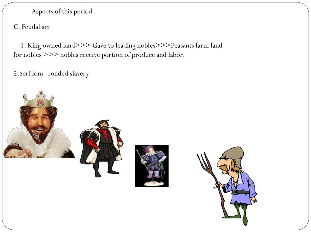 C. Feudalism 1. King owned land>>> Gave to leading nobles>>>Peasants farm land for nobles >>> nobles receive portion of produce and labor. 2.Serfdom- bonded slavery Aspects of this period :