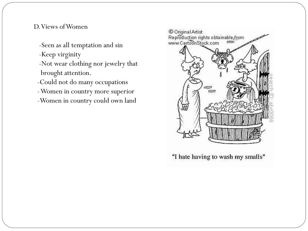 D. Views of Women -Seen as all temptation and sin -Keep virginity -Not wear clothing nor jewelry that brought attention. -Could not do many occupations - Women in country more superior -Women in country could own land