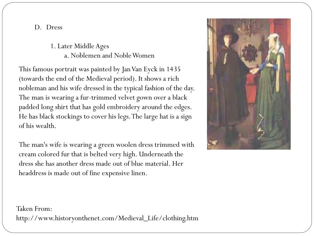 Dress 1. Later Middle Ages a. Noblemen and Noble Women This famous portrait was painted by Jan Van Eyck in 1435 (towards the end of the Medieval period). It shows a rich nobleman and his wife dressed in the typical fashion of the day. The man is wearing a fur-trimmed velvet gown over a black padded long shirt that has gold embroidery around the edges. He has black stockings to cover his legs. The large hat is a sign of his wealth. The man's wife is wearing a green woolen dress trimmed with cream colored fur that is belted very high. Underneath the dress she has another dress made out of blue material. Her headdress is made out of fine expensive linen. Taken From: http://www.historyonthenet.com/Medieval_Life/clothing.htm