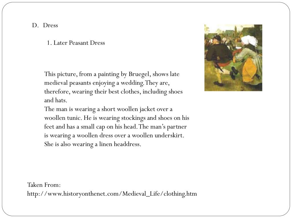 Dress 1. Later Peasant Dress This picture, from a painting by Bruegel, shows late medieval peasants enjoying a wedding. They are, therefore, wearing their best clothes, including shoes and hats. The man is wearing a short woollen jacket over a woollen tunic. He is wearing stockings and shoes on his feet and has a small cap on his head. The man’s partner is wearing a woollen dress over a woollen underskirt. She is also wearing a linen headdress. Taken From: http://www.historyonthenet.com/Medieval_Life/clothing.htm
