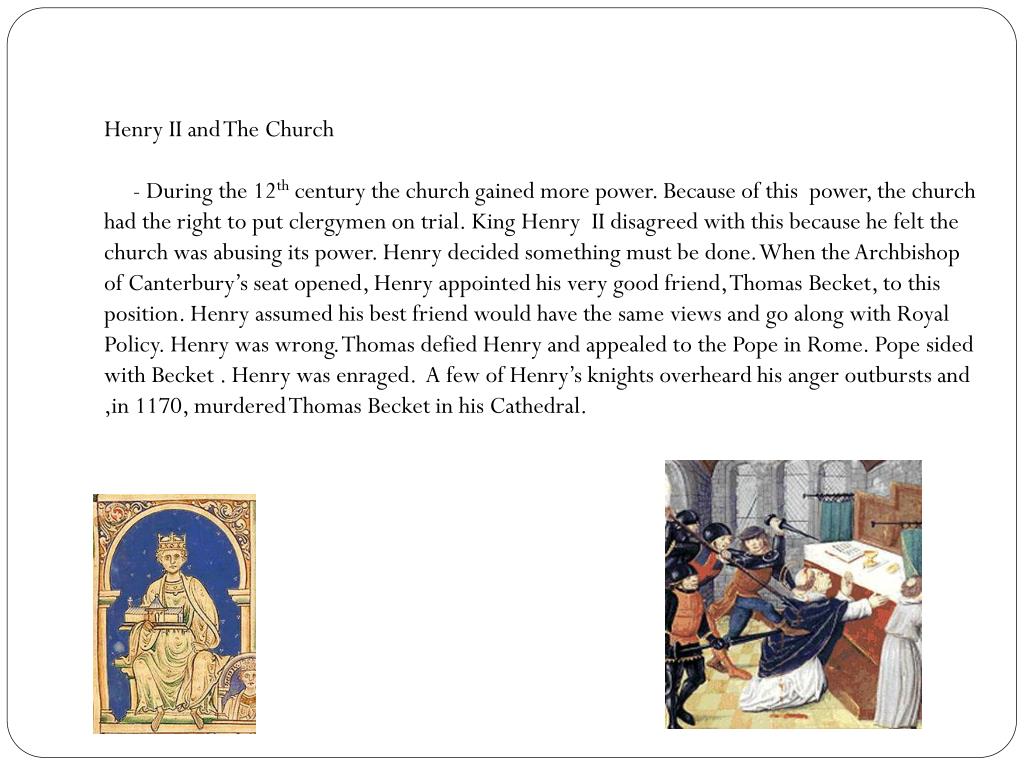 Henry II and The Church - During the 12th century the church gained more power. Because of this power, the church had the right to put clergymen on trial. King Henry II disagreed with this because he felt the church was abusing its power. Henry decided something must be done. When the Archbishop of Canterbury’s seat opened, Henry appointed his very good friend, Thomas Becket, to this position. Henry assumed his best friend would have the same views and go along with Royal Policy. Henry was wrong. Thomas defied Henry and appealed to the Pope in Rome. Pope sided with Becket . Henry was enraged. A few of Henry’s knights overheard his anger outbursts and ,in 1170, murdered Thomas Becket in his Cathedral.