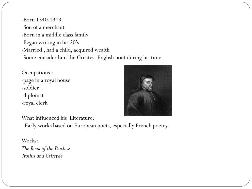 -Born 1340-1343 -Son of a merchant -Born in a middle class family -Began writing in his 20’s -Married , had a child, acquired wealth -Some consider him the Greatest English poet during his time Occupations : -page in a royal house -soldier -diplomat -royal clerk What Influenced his Literature: -Early works based on European poets, especially French poetry. Works: The Book of the Duchess Troilus and Criseyde