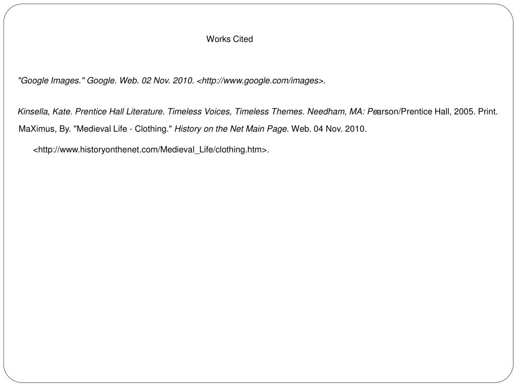 Works Cited "Google Images." Google. Web. 02 Nov. 2010. <http://www.google.com/images>. Kinsella, Kate. Prentice Hall Literature. Timeless Voices, Timeless Themes. Needham, MA: Pearson/Prentice Hall, 2005. Print. MaXimus, By. "Medieval Life - Clothing." History on the Net Main Page. Web. 04 Nov. 2010. <http://www.historyonthenet.com/Medieval_Life/clothing.htm>.