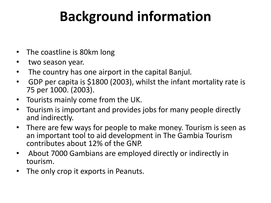 Background information • The coastline is 80km long • two season year. • The country has one airport in the capital Banjul. • GDP per capita is $1800 (2003), whilst the infant mortality rate is 75 per 1000. (2003). • Tourists mainly come from the UK. • Tourism is important and provides jobs for many people directly and indirectly. • There are few ways for people to make money. Tourism is seen as an important tool to aid development in The Gambia Tourism contributes about 12% of the GNP. • About 7000 Gambians are employed directly or indirectly in tourism. • The only crop it exports in Peanuts.