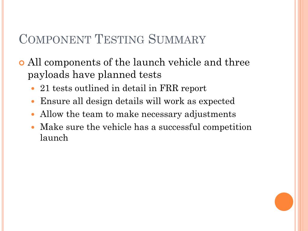 Component Testing Summary • All components of the launch vehicle and three payloads have planned tests • 21 tests outlined in detail in FRR report • Ensure all design details will work as expected • Allow the team to make necessary adjustments • Make sure the vehicle has a successful competition launch