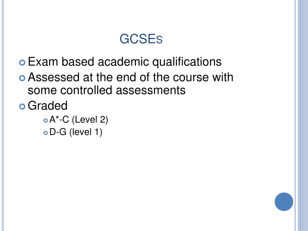 GCSEs • Exam based academic qualifications • Assessed at the end of the course with some controlled assessments • Graded • A*-C (Level 2) • D-G (level 1)