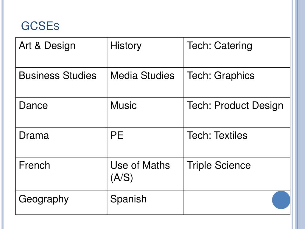 English Baccalaureate • A fairly new qualification that shows if a student has a good overall academic ability • GCSE passes in: • English Language • Mathematics • Two Sciences (Core + Additional / Triple / computer science) • Language • Humanities (Geography or History)