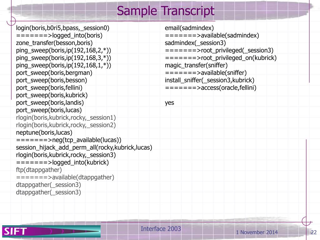 login(boris,b0ri5,bpass,_session0) =======>logged_into(boris) zone_transfer(besson,boris) ping_sweep(boris,ip(192,168,2,*)) ping_sweep(boris,ip(192,168,3,*)) ping_sweep(boris,ip(192,168,1,*)) port_sweep(boris,bergman) port_sweep(boris,besson) port_sweep(boris,fellini) port_sweep(boris,kubrick) port_sweep(boris,landis) port_sweep(boris,lucas) rlogin(boris,kubrick,rocky,_session1) rlogin(boris,kubrick,rocky,_session2) neptune(boris,lucas) =======>neg(tcp_available(lucas)) session_hijack_add_perm_all(rocky,kubrick,lucas) rlogin(boris,kubrick,rocky,_session3) =======>logged_into(kubrick) ftp(dtappgather) =======>available(dtappgather) dtappgather(_session3) dtappgather(_session3) email(sadmindex) =======>available(sadmindex) sadmindex(_session3) =======>root_privileged(_session3) =======>root_privileged_on(kubrick) magic_transfer(sniffer) =======>available(sniffer) install_sniffer(_session3,kubrick) =======>access(oracle,fellini) yes Sample Transcript Interface 2003