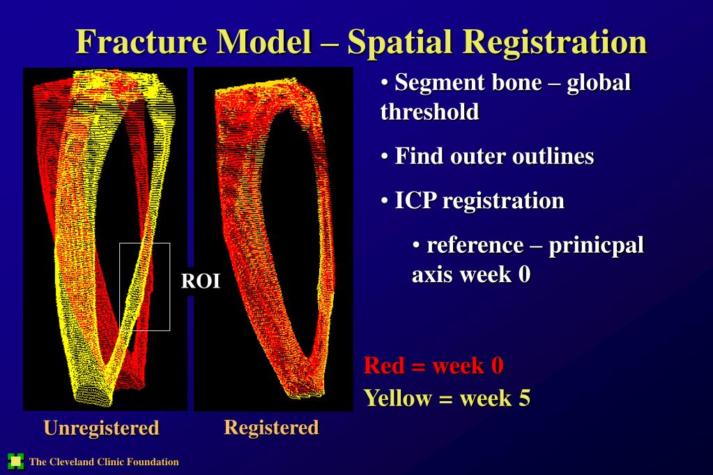 Registered Unregistered Fracture Model – Spatial Registration • Segment bone – global threshold • Find outer outlines • ICP registration • reference – prinicpal axis week 0 ROI Red = week 0 Yellow = week 5