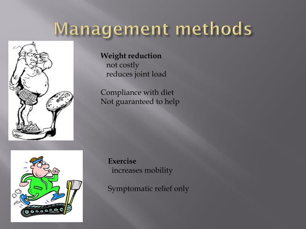 Management methods Weight reduction not costly reduces joint load Compliance with diet Not guaranteed to help Exercise increases mobility Symptomatic relief only