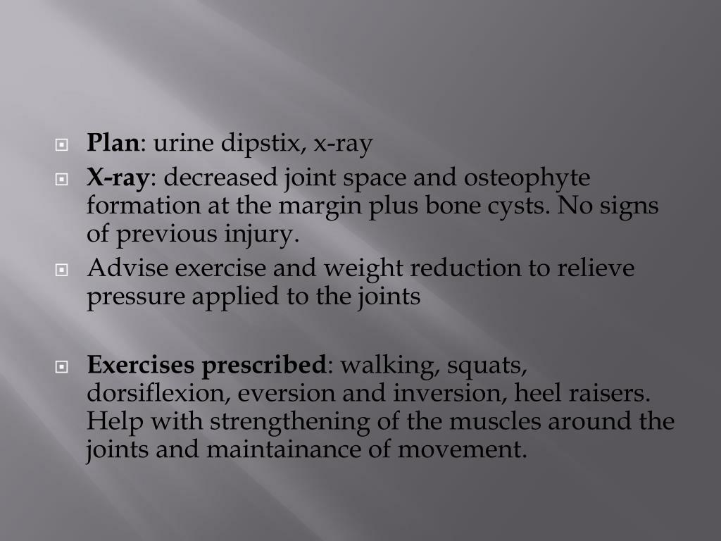 Plan: urine dipstix, x-ray • X-ray: decreased joint space and osteophyte formation at the margin plus bone cysts. No signs of previous injury. • Advise exercise and weight reduction to relieve pressure applied to the joints • Exercises prescribed: walking, squats, dorsiflexion, eversion and inversion, heel raisers. Help with strengthening of the muscles around the joints and maintainance of movement.