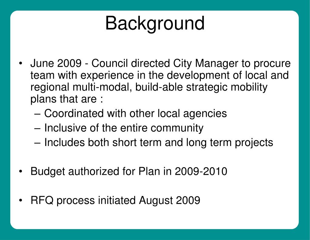 June 2009 - Council directed City Manager to procure team with experience in the development of local and regional multi-modal, build-able strategic mobility plans that are : Coordinated with other local agencies Inclusive of the entire community Includes both short term and long term projects Budget authorized for Plan in 2009-2010 RFQ process initiated August 2009 Background