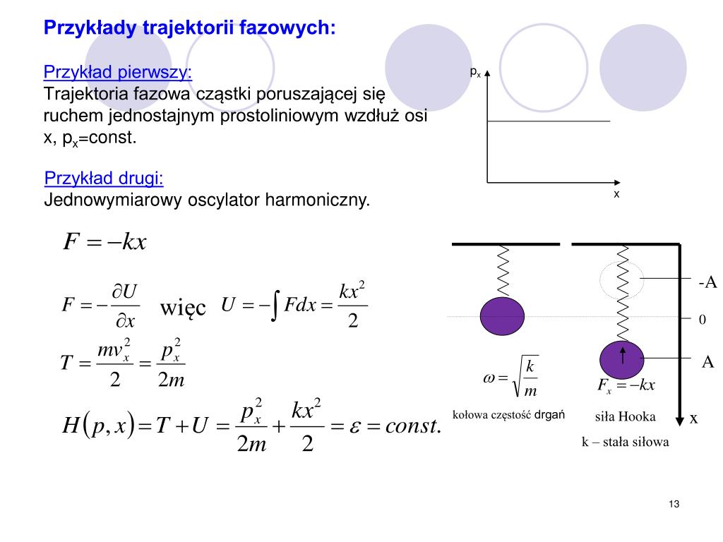 px x Przykłady trajektorii fazowych:Przykład pierwszy:Trajektoria fazowa cząstki poruszającej się ruchem jednostajnym prostoliniowym wzdłuż osi x, px=const. Przykład drugi:Jednowymiarowy oscylator harmoniczny. -A 0 A x kołowa częstość drgań siła Hooka k – stała siłowa